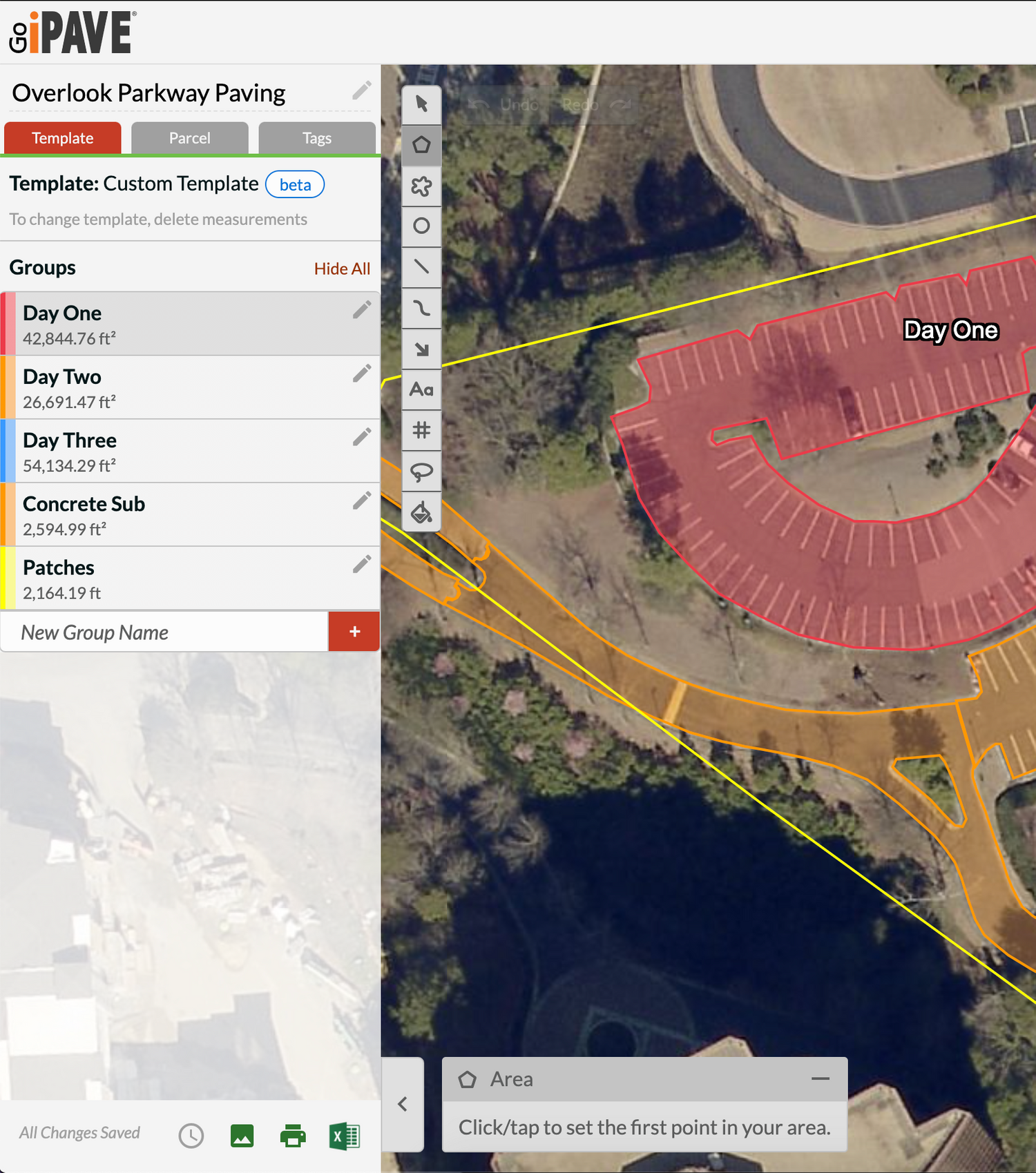 Large paving projects will require multiple phases of work. Visually communicate your multi-part plan with your clients by labeling the map and color-coding the phases of work.